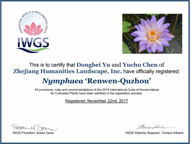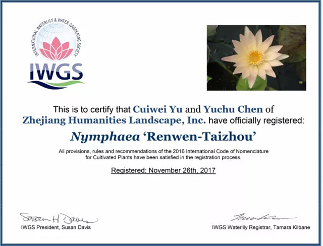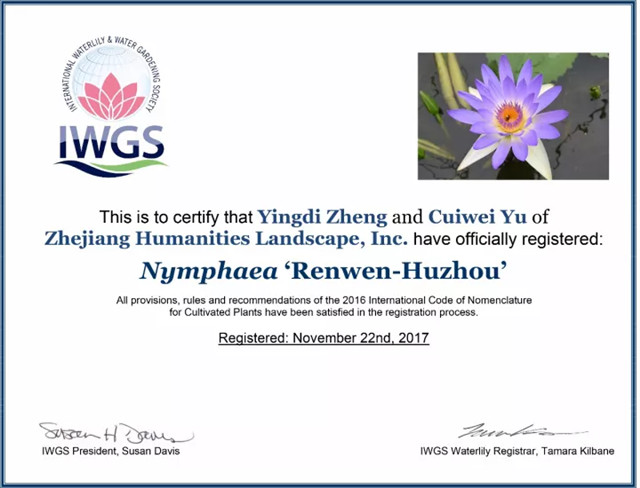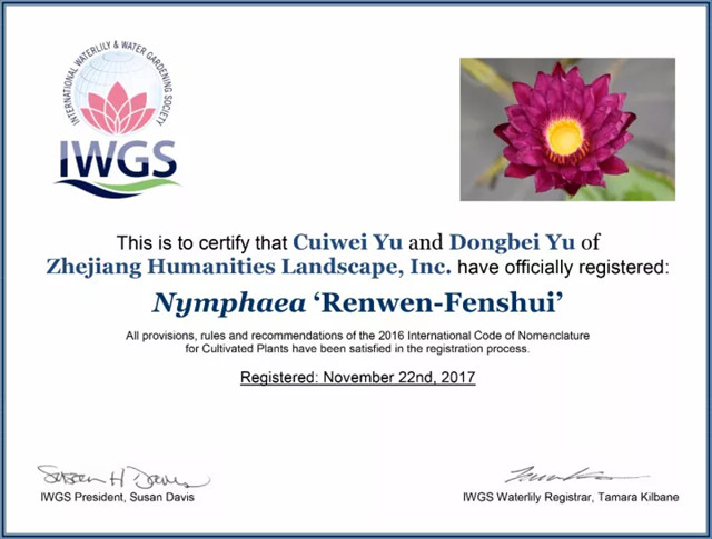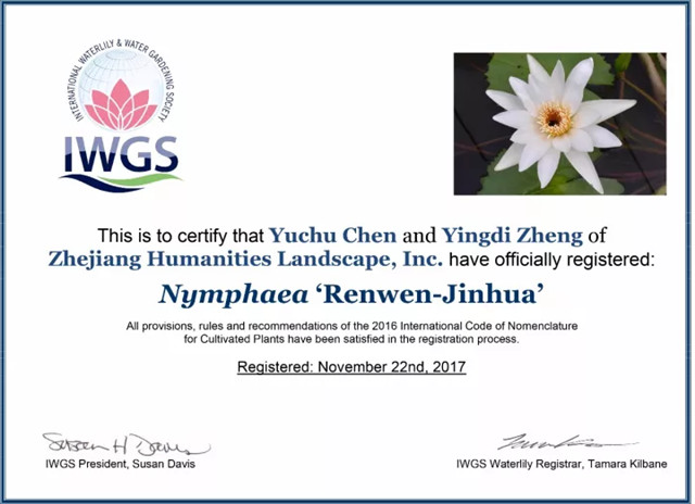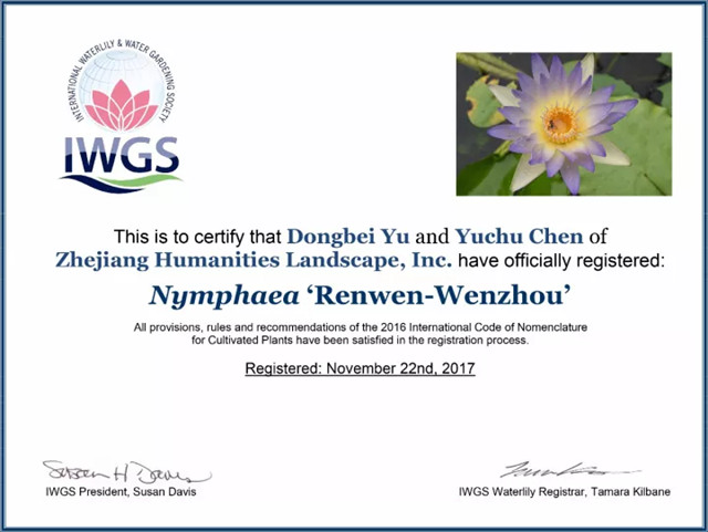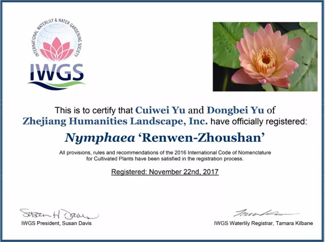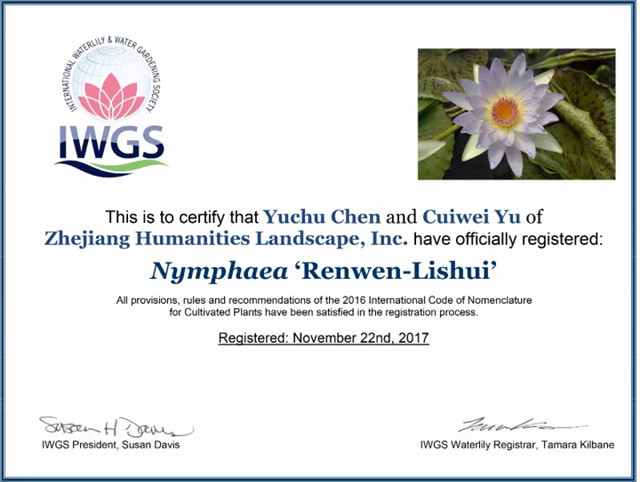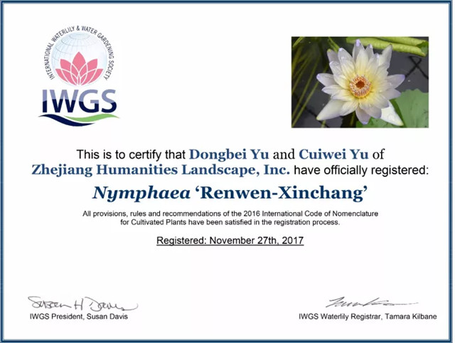 浙江人文園林股份有限公司繼去年(2016年)獲得10個睡蓮新品種國際登錄后,于今年(2017年)北京時間11月28日夜間,又接到位于美國的登錄權威發來的10個睡蓮新品種國際登錄證書電子版。加上此前獲得的新品種國際登錄證書,目前人文園林總共擁有20個睡蓮屬新品種國際登錄、27個蓮屬新品種國際登錄證書和1個鳶尾國際登錄證書。在園林水生植物新品種的培育以及園林植物的應用上,人文園林總是在不斷地突破自己,為生態城市、多彩園林奉獻自己的一份力量。