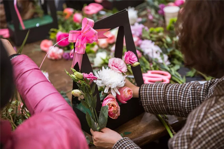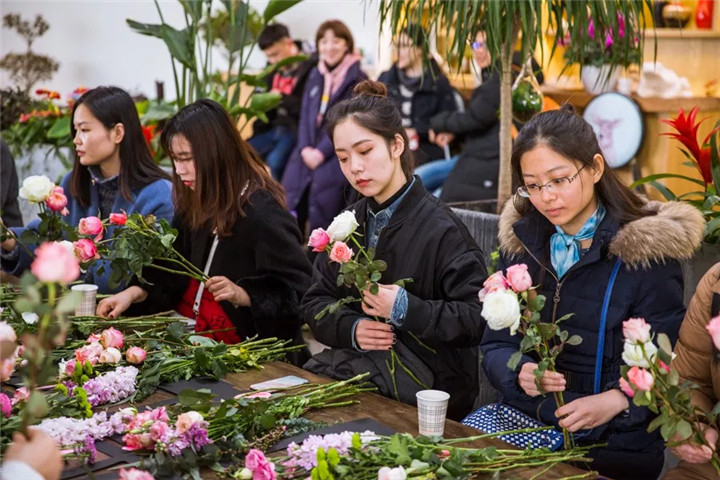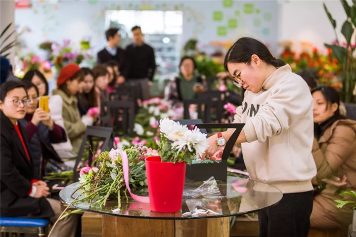 花藝師通過現場示范,給大家認真講解了花藝架構及花籃制作的要點。學員們全神貫注,聽得津津有味,講解一結束,就迫不及待地動手操作起來,將一束束春天,通過自己的巧手裝進花籃,提回家中。