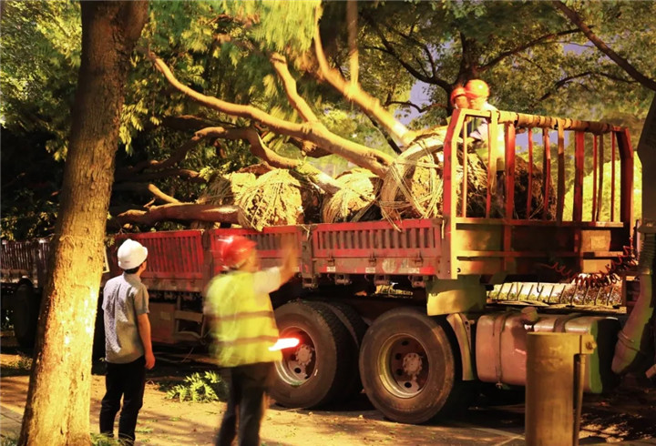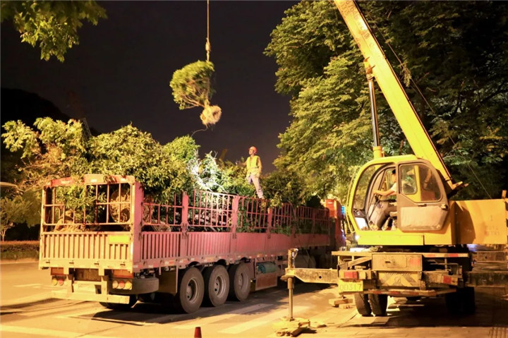 近日,如果你走在杭州天目山路的古翠路-萬塘路段,會看到路的兩邊豎起圍擋,工人們正小心翼翼將路邊一棵棵樹木挖起;如果你因為加班或夜游恰巧在凌晨三點路過,會看到那一顆顆捆扎好土球的樹木正被吊起、運走。