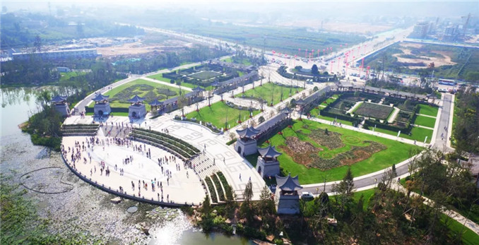 韓城國家文史公園西入口的營造踐行“科藝同構、古今同構、中外同構”的造園理論,在傳統長廊與鼓樓圍合下,用數十品種月季繪成漢代龍鳳圖案,迎接過往游客,也反映了韓城深厚的歷史文化底蘊。