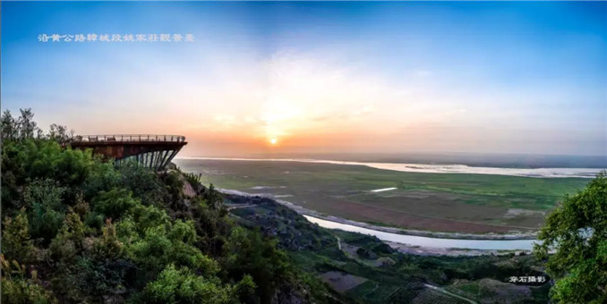 沿黃公路韓城段的景觀營造,猶如在黃河岸邊展開一幅立體長卷,充分展現了中國園林的繪畫美、意境美。位于南段黃河最寬處的船頭形觀景臺,朝向黃河奔流的方向,似欲順流而下,一日千里,是建筑的大地藝術化,寓意在“三十年河東,三十年河西”的滄桑巨變中,高速發展的韓城猶如一艘巨輪啟碇遠航、乘風破浪。在觀景臺上遙望日月升起,極目千里,景象壯闊,正是韓城蒸蒸日上之勢。