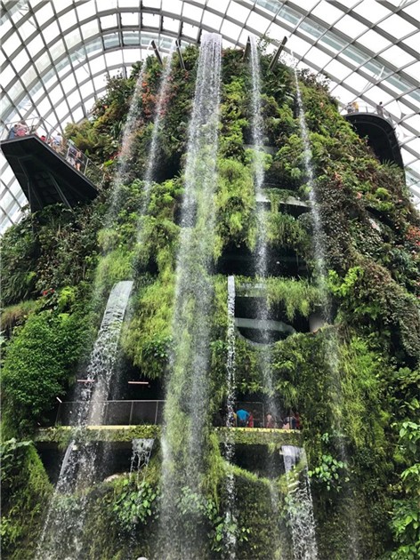 濱海灣花園設計集中了立體綠化的最新高科技手段。南花園正中央的幾棵巨型擎天大樹巍然聳立,分別介于 9~16 層樓高。云霧林是濱海灣花園的另一大特色,35m 高的蒼翠云山煙霧繚繞,宛若仙境,全球最高的室內瀑布在此飛流直下。花園還囊括逾 25 萬棵珍稀植物。