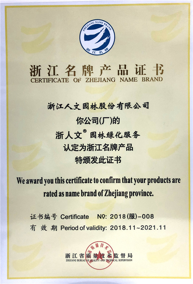 人文造園,質(zhì)量為本,服務(wù)為先。繼2017年被評為“杭州服務(wù)名牌”后,2018年,浙江人文園林股份有限公司的“園林綠化服務(wù)”進(jìn)一步被認(rèn)定為“浙江名牌產(chǎn)品”。
