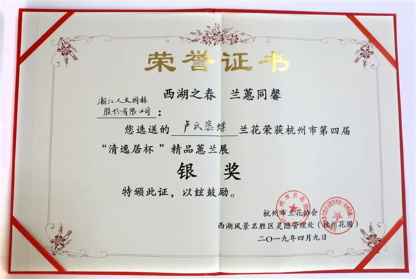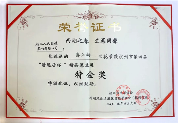 正是西湖四月天,桃紅柳綠,百花盛開,如詩如畫。年初的杭州市民蘭花節熱鬧勁剛過,4月9日,在和煦的春風和幽幽的蘭香中,江南古典名園郭莊又迎來了“西湖之春 蘭蕙同馨”2019第四屆中國杭州蕙蘭精品展的開幕。開幕式上揭曉了本次蕙蘭展的獲獎名單,浙江人文園林股份有限公司的展品“春江梅”一舉奪得特金獎,展品“盧氏蕊蝶”榮獲銀獎,副總裁錢茜萍出席開幕式并代表公司領獎。