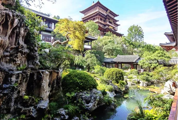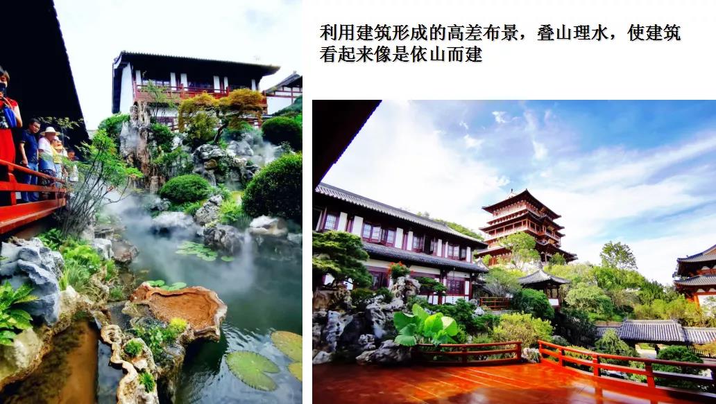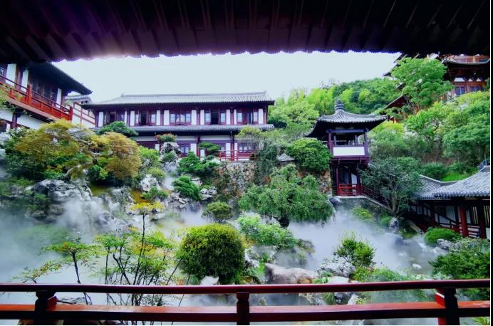 陳勝洪會長帶領大家重點參觀考察寺院內由浙江人文園林股份有限公司打造的天下徑山苑項目。項目總體設計構思是:以沈周的《廬山高圖》為摹本,以“天下徑山”為主題,以山-水-林-云構成的立體山水庭院。根據其功能特點定位其文化風格為“禪房花木深”,根據其空間特點定位其布局為“高山流水”的山水畫園。集名山之最,形成雙峰對峙、奇峰怪石、絕壁千仞、峽谷縱橫、溶洞溪瀑、霧淞花海的園林布局和景觀特色。▲人文園林-天下徑山苑項目景觀